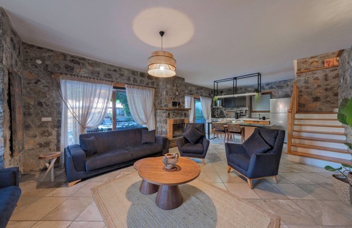Living Room: Villa KAYAKÖY's air-conditioned living room includes a cozy and comfortable seating group, fireplace, dining table and chairs for 8 people, satellite TV and wireless internet. There is a bathroom, sink and WC.