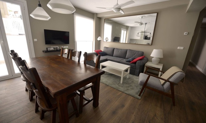98 m2 and large terrace which is accessed from all rooms. Very bright and comfortable. Three bedrooms and two full baths. Two of the bedrooms have a large bed (160x200) and one of them has its own private bathroom. The other bedroom has two single beds (90x200). all rooms have large closets and televisions. Fully equipped kitchen with hob, oven, microwave, coffee maker, refrigerator, dishwasher, washing machine, dryer, dishes, etc. Spacious living room, with a 40 "smart TV and a large sofa, convertible into a double bed (150x200) that could be occupied by additional travelers. Dining room for 8 diners. The apartment has heating and hot water from the gas boiler, so there is no problem that you can run out of hot water during the shower.