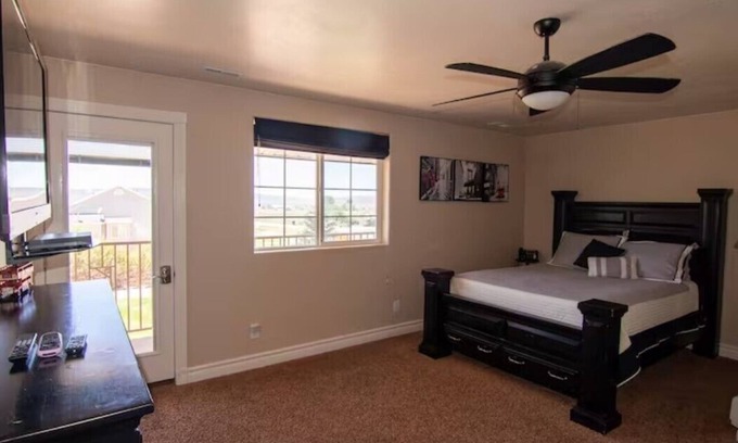 The property is located at the base of Brian Head, about a 20 minute drive up/down the mountain. It is located in Parowan on the road to the Gap. This bedroom features balcony access with spiral stairway to the rear deck and BBQ courtyard area.