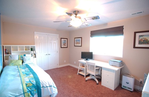 Bedroom with a Twin Bed, 46 inch LCD TV/DVD ( Satellite TV with 100 plus channels), and full house privileges at the Tacit Shadow Resort property in Parowan at the base of the Brian Head resort mountain.