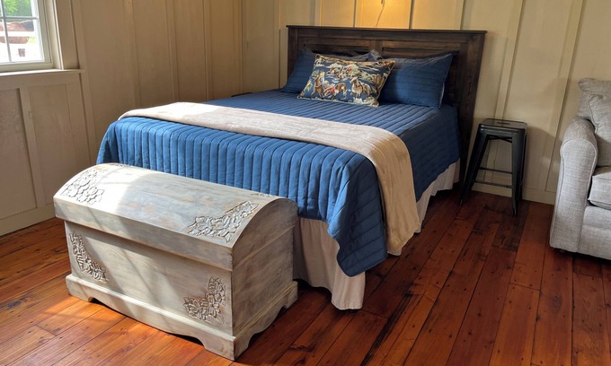 The Tack Room is arranged in a studio style, with a private bathroom offering a shower, toilet and sink. The full kitchen boasts a stove and oven, full-sized refrigerator, microwave, and all of the cookware and place settings you might need. The comfy sofa pulls out into double bed to provide more sleeping options. There are blackout shades on the windows to allow for peaceful rest even after the sun has risen. Feel free to draw back the shades to see the horses being feed just across the drive. Immerse yourself in the country experience seated on the covered porch. The fire pit and grill, just out front, are a great options for searing that steak to perfection. This cozy space is tastefully decorated and as sharp as a Tack!