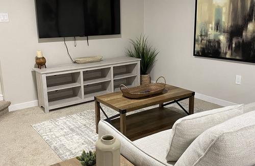 Downstairs has a large great room that has table tennis and game area. It hosts two more bedrooms and full bathroom.