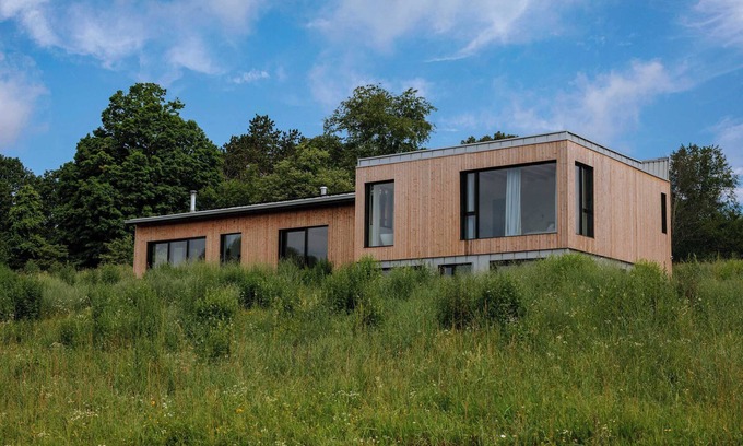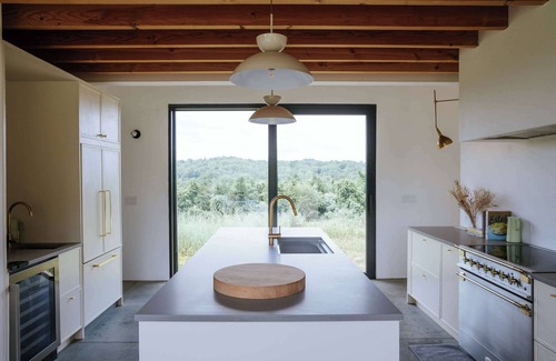 Escape to this serene, Scandinavian-inspired retreat tucked into a quiet hillside in the Hudson Valley and set on 16 acres with sweeping views of the Catskills, wildflower meadows, and forest.