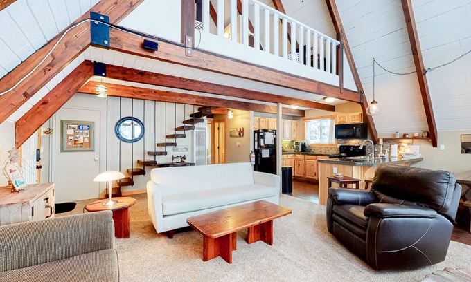 Forgo the winter blues this year and embrace the chill with a cup of hot cocoa at South Lake Tahoe's Winter Wonderland retreat. This house provides all the modern comforts of home with rustic touches and exposed wooden beams. You'll be wowed by the wall of floor-to-ceiling windows and its forest views. The open layout is perfect for a family bonding trip, with the main living area featuring a wood stove for cozying up at the end of a long day. The well-equipped kitchen has all the necessities and then some. Make use of the bonus kitchen gadgets like a waffle iron, electric kettle, and French press to do breakfast up right! Climb the floating staircase to a loft space that will make the perfect kids' clubhouse. This upstairs bonus room has an additional sleep space, half bath, flat-screen TV, and even a computer desk for your remote school or work needs. The nearest slopes are less than ten miles away, and you can soak in the luxurious hot tub after a fun day on the slopes. And, when the weather warms up, you're even closer to the lake and all of its water sports opportunities. Spring and summer are also the ideal time to take advantage of this home's private furnished deck and gas grill, just waiting to host your next family barbecue.