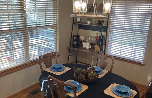 Enjoy the quaint town of Norfork, Ar! This home offers everything you need to have a fabulous weekend or vacation stay! Sleeps 7 comfortably! We also have a pack-n-play and a twin size air bed both complete with linens. Each bedroom has its own private bath, in addition to a half bath and laundry room in the hallway. Each bedroom has a smart tv and a 65” smart tv in the living area. TVs are set to guest mode so you will be able to log in safely to your current subscriptions! The living room area is stylish and comfortable and is open to the kitchen and dining area. The kitchen has a dining table and a 4 seat bar and everything you need to make a delicious meal! Step out to the wrap around deck and enjoy a bbq on the gas grill and eat outside and listens to the birds! Later in the evening, enjoy a nice fire and make s’mores in the fire pit area! You are a 2 minute walk to the confluence of the Norfork and White Rivers, and a 4 minute drive to Lake Norfork access and the Norfork dam. The eateries are in walking distance from the home! The Norfork Cafe offers a delicious breakfast all day! Heidi’s Ugly Cakes and Sandwiches offers fantastic homemade desserts and the best Reuben around! The Norfork Brewery will be a favorite and the pizza is amazing!! The town and neighborhood are quite and peaceful and offer that hometown feel everyone loves! There are so many things close by and so many beautiful sights to see!