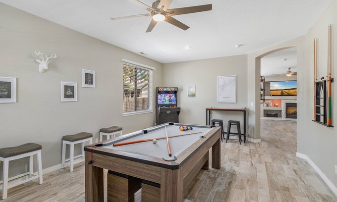 ✔ Family Room: A billiards table, upright arcade with multiple classic games, and wall-mounted Smart TV for endless entertainment.