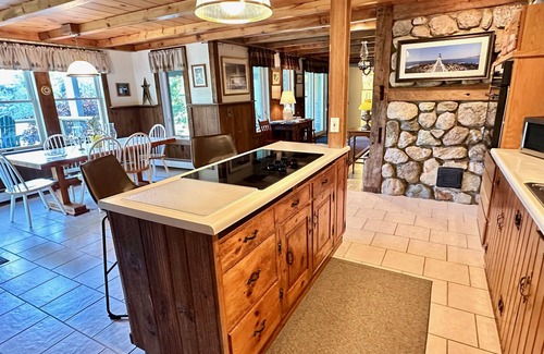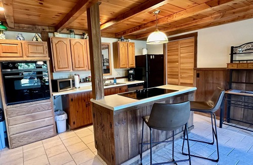 Centrally located on Mount Desert Island is "Tall Pines" Retreat on Ripple Pond. Tucked away, down a private drive on Pretty Pond in Historic Somesville on a 3 1/2 acre wooded and grass lot, is our spacious 1,200 square foot downstairs 1-bedroom suite with a full kitchen and living area, full size washer/dryer with 2 private entrances, and large deck; facing over 1/2 mile of uninhabited woods and wildlife wetland that used to be part of Acadia National Park. It is very, very private and you won`t see a soul from your front deck or windows. Your suite features a large stone fireplace with a wood stove and leather sofa, wood beamed ceilings, and a 280 square foot country kitchen. It also has a separate TV area with a comfy sectional sofa and an extra large flat screen TV.
