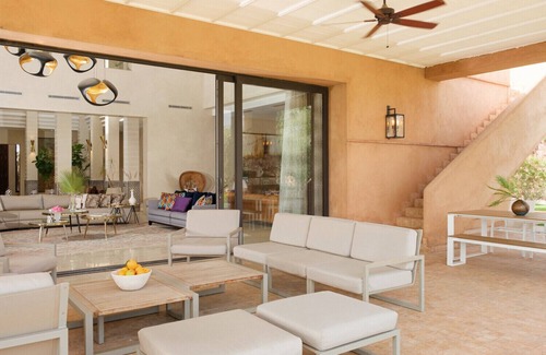 Villa Tamari is a luxurious retreat offering a peaceful environment surrounded by lush gardens. This villa combines traditional Moroccan charm with modern amenities, featuring nine spacious bedrooms, each with its own en-suite bathroom, and a private heated pool perfect for relaxation.