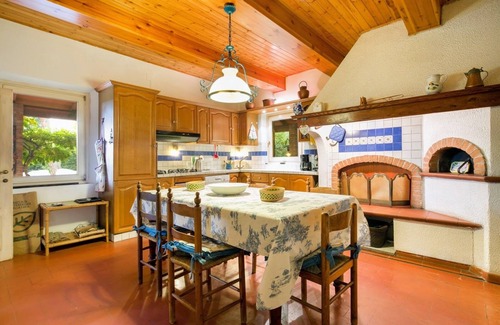 The large space surrounding the house makes it perfect for groups of friends or large families looking to have a relaxing holiday and the possibility for children to play outside. The house is part of a 9000 sq. m. property, all fenced, with a large garden made up mostly of lawns and embellished with high trees and bushes which create shaded areas where you will find the ping pong table and a small grass football pitch. In the garden you will also find the private, fenced swimming pool, measuring 15 metres by 7 with a depth of 0.6 to 2.1 metres, surrounded by a bathing area complete with sunbeds, beach umbrellas and an outdoor hot water shower. In front of the house’s main entrance there is a charming pergola with a fitness area and a dining area with a table and chairs. The stone barbecue is just a few metres from here. One corner of the garden has a large enclosure, partly covered, where dogs can be kept if required by the client. Covered parking in the property.Interior
