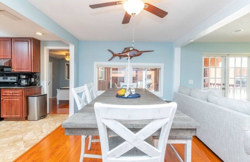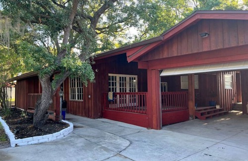 Amazing Tampa Bay house on huge 1+ acre lot. Beautiful Cypress wood exterior with a total of 3 bedrooms/2.5 bathrooms. Will sleep 7 people. Master bedroom & kids room have private bathrooms w/walk-in showers. Fully furnished kitchen, laundry room, huge 85" HD smart TV, outdoor dining area on porch that seats 6, two-car garage, and access to a two-story 175 ft long dock with sundeck, outside shower, & fish cleaning station. Enjoy swimming, kayaking & fishing right off the dock.
