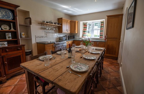 A spacious kitchen with a big electric range cooker, microwave, fridge/freezer and washing machine.The centrepiece is a large farmhouse dining table.