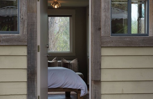 The Studio is a classic, small and private wine country cabin, next to the main house, recently remodeled, and consisting of a well-appointed room with queen bed and beautiful French doors opening onto a private patio with French café table and chairs, in the shade of a mature redwood tree, and with commanding views of the pool and garden. The studio is detached from the main house and does not have its own bathroom, so may be more suitable for day use, depending on your needs.