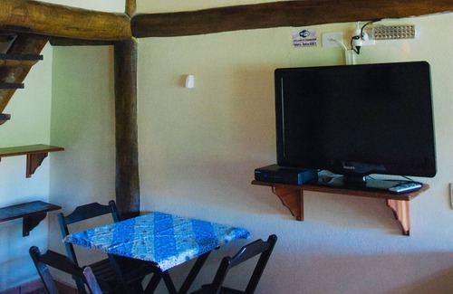 Our duplex chalet contains: Balcony with hammock - Equipped kitchen - Table and Chairs - Double Bed with quality Mattress Living Room with Sofa Bed - Mezzanine - Led TV with Sky - Air Conditioning (Hot and Cold) - Fan - Toilet and Parking