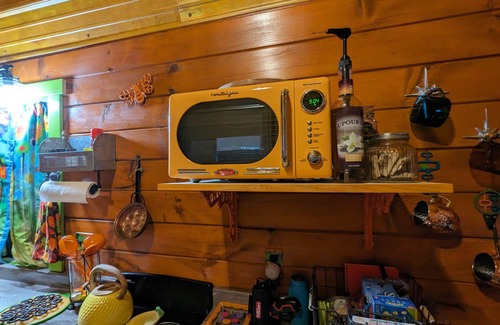 Our Tangerine Dreams cabin is newly built with pretty décor & decorative bed covers, all adding to the cabin’s ambiance with a mix of boutique/fun artsy flare ~ You’ll find orange, citrus and MCM décor throughout the cabin; Real copper kitchen sink with brass dragon faucet, red/yellow glass bathroom sink on live-edge wood. Hand-built furniture, tree timber porch & loft rails, and interior tung & groove wall boards from local Amish-milled wood. We love eye candy! We don't do cookie cutter furnishings. See photos :) Our other cabins are Ruby Ravine (red + pretty rustic/retro themed), Riverside Blue (blue + forest themed), Sapphire Springs (blue + water themed) and Emerald Forest (green/magical forest themed – coming April 2024).