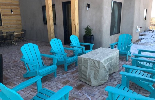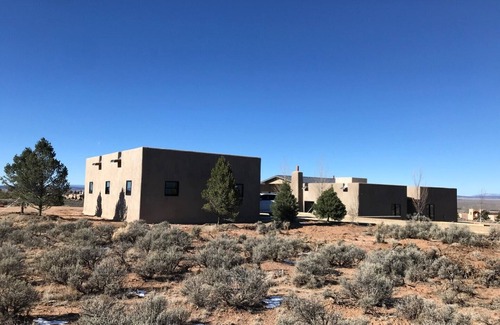 Outside; dining table + Adirondack chairs around the fire pit. 3-car garage. Landscaped with 30 transplanted trees of 5 varieties--just wait til the spring!! Taos Country Club is just south of town, Taos Ski Valley is just north; about 20 miles. Close to shopping in Taos, golf, fishing, hiking, etc. 65 miles from Santa Fe Plaza--about the same to Santa Fe Airport (American & United).
