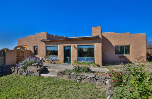New home with New Mexico charm, nestled at the foot of the mountain. Private and conveniently located near local resturants, nature attractions, shopping. 360 degree views, stunning sunsets and wide open spaces. Brand new high quality furnishings and mattreses with orginal art by Taos artists. Clean, comfortable, and well appointed. This home will not disappoint. The world class Taos Ski Valley is a 15 minute drive north, and the spectacular Rio Grande Gorge with white water rafting, fly fishing and hiking is even closer. Taos Plaza and Taos Pueblo are just 15 minutes away. Come immerse yourself in the real Taos with it's amazing natural beauty and it's unique cultural influence, unlike anywhere in the country. We just added a beautiful outdoor dining/leisure covered space facing Taos Mountain. Fenced yard, good dogs welcome.