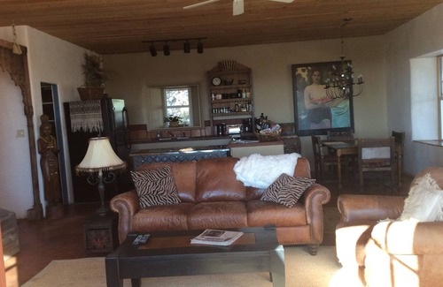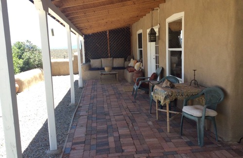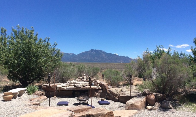 Taos New Mexico, Our Gorgeous Straw Bale Home is sunny filled and a perfect spot to get away from it all! Our home sleeps 6 comfortably and has a large open floor living/dining/kitchen area. Please note our home can sleep more with air mattresses etc. Send me a message for more info about larger groups-Wonderful for families and friends visiting. Home close to everything Northern New Mexico has to offer. Taos Ski Valley Skiing, hiking, culture sites, natural hot springs close by, the Rio Grande gorge bridge, shopping and dining. Casa Del Sol our home of the sun- Big open skies await you here, we have 360 degree views and oh the sunsets and sunrises are beyond amazing. Our home is nice and cozy all year long, we have a side fully fenced yard for your pets. The front of home features a bubbling fountain and an adorable old chapel building. Large patio awaits you for evening drinks and game playing. Winter Skiing Specials: 20% off midweek- Calendar has been adjusted-