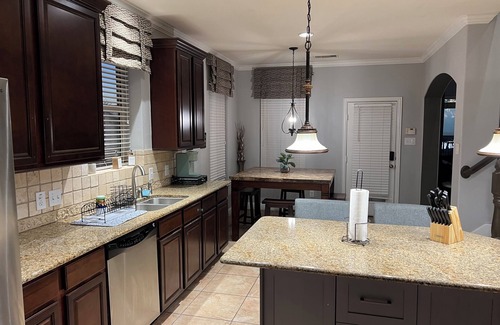 Forget your worries in 3,200 SF of our newest renovated home with a spacious eat-in, open & fully equipped kitchen. Enjoy the peaceful lakeside view while sitting on your covered patio or take a stroll on the walking trails. Host Family & Friends and retreat to a Master Suite with separate Office & Hi-Speed Internet. Just minutes from restaurants, shopping and entertainment! You’ll definitely love your stay at this lakeside beauty!