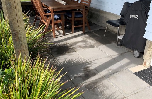 The compact living area with TV, opens out to a sheltered courtyard, where you can enjoy dining and socialising.