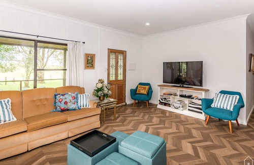 Our updated timber farmhouse greets you as you enter the property with its charming deck and veranda surrounded by an establishing orchard of pears, avocadoes, apples, walnut, and chestnuts. The recently updated country kitchen with its views to the vegetable garden truly holds its own with the beautiful Smeg electric oven with induction cooking, as the centerpiece. The three generous sized bedrooms all have built in robes and the family bathroom with its retro feel is neat and practical with separate bath, shower, and vanity. Separate toilet and a good-sized laundry make up our charming home. But don't forget the outdoor dining for fine weather and the biggest fire pit you've ever had the chance to enjoy.