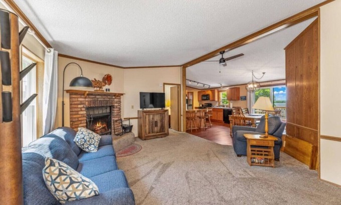 Featuring four generously-sized bedrooms, including two queen beds and six twin beds, there is ample space for guests to unwind after the festivities. The cabin boasts two bathrooms, ensuring everyone has the privacy they need. You can enjoy cozy evenings by the fireplace or stay cool with air conditioning in warmer months. Prepare delightful meals in the fully equipped kitchen or take advantage of the outdoor Weber grill and picnic table for a charming al fresco dining experience. For entertainment, relax on the sofa sleeper while watching your favorite shows on the flat-screen TV, or connect with loved ones via complimentary WiFi. A crib and high chair are also available at no extra charge for those traveling with little ones.