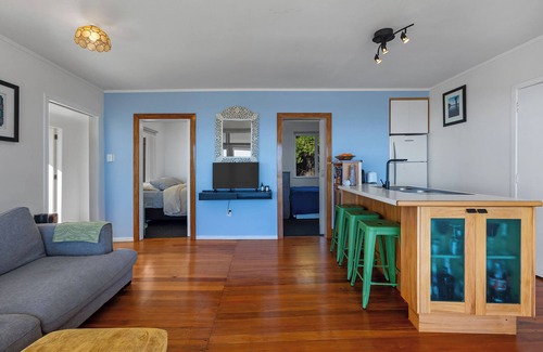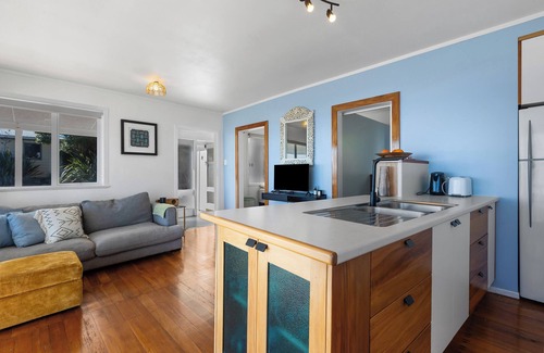 This compact coastal haven sleeps up to five guests across one spacious bedroom, a cosy single room, and a separate sleepout with a queen bed, accessed externally. Simple and homely, Te Hū offers everything you need for a comfortable stay: a ceramic cooktop, air fryer, Smart TV, Wi-Fi, and laundry facilities (washing machine and dryer).