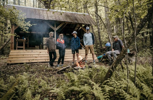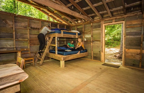 Our most remote cabin, nestled in the woods between two creeks, Teela Springs and Cold Spring Branch. Two bunk beds (double on the bottom and twin up top) provide lots of room for comfortable sleeping. Look out over the fire while cooking dinner on the propane stove with full kitchen amenities available. Relax on our rustic bench by the fire under the glow of solar lights. Read by lantern light on our comfy mattresses while charging your devices on our solar powered battery.