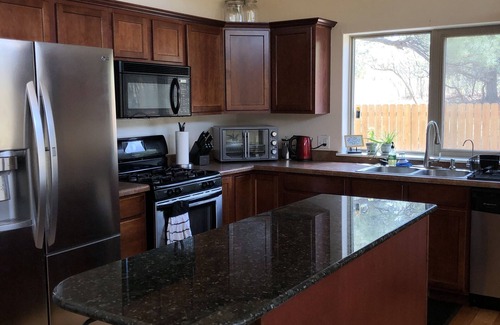 Updated designer 'farmhouse' furniture throughout. New fans and lighting. New water-heater. Gas fireplace. Master bedroom features a very comfortable Tuft&Needle king-size bed. Guest bedroom features same quality bed in full-size. Child's room has a twin bed. New deck with pavilion for sunset dinners. New chicken coop, so bring your birds. No-maintenance yard. Trails outside the back door. Absolutely quiet area, no traffic noise. We prefer quiet and responsible guests! No parties or loud dogs, sorry, the neighbors won't have it!
