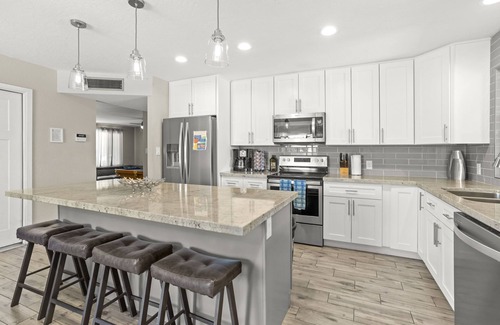 Your stay at this exceptional house includes numerous amenities to enhance your experience. Delight in the inviting backyard oasis featuring a sparkling pool, putting green, and a grill for those memorable barbecues. Inside, you'll discover three tastefully decorated bedrooms, accommodating up to 10 guests, outfitted with plush linens for restful nights. The open-concept kitchen boasts high-end stainless steel appliances, perfect for catering your wedding preparations, while the game room offers fun entertainment options like a pool table and flat-screen TV for relaxation after the big event.