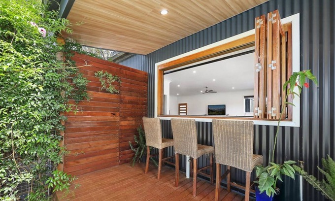 Inside, the lodge features spacious indoor-outdoor living, two queen bedrooms, a fully equipped kitchen and laundry, and year-round comfort with a wood fire and split system. Outside, you'll find a covered deck with comfortable seating, a mounted TV, and a beautiful marble outdoor bath with hot and cold water — perfect for star bathing under wide skies.