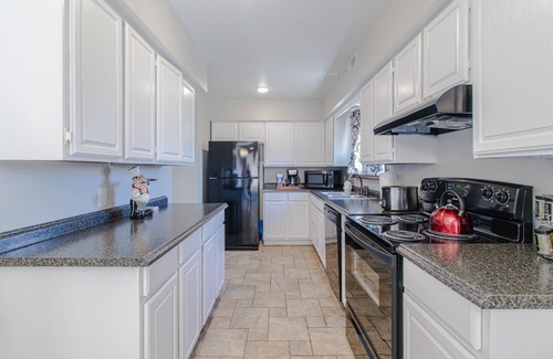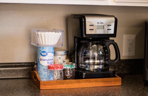 We have a fully stocked kitchen with coffee maker. We have a full bathroom upstairs with a deep soaker tub and a SMALL bathroom with a shower, toilet and small sink downstairs.