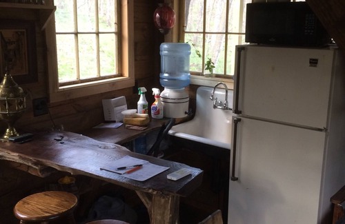 Another off the grid whimsical gem in the Ten Acre Treehouse's forest! "The Captains Quarters" This is the second treehouse in rural Nauvoo, which will be available to rent starting May 2016! A lot of the same touches found in "The Whitetail" the first treehouse here, You will find in this Nautical inspired creation. This treehouse will be twice as big as the first (400 sq ft.) and features a full second story master bedroom, sleeper sofa on the first floor, small kitchen area with refrigerator w/freezer, microwave, coffee maker, plates, silverware, cups and a sink! Upon entering the treehouse you are treated to the huge map of the world as you look up in the 13' vaulted entryway. A small window seat area creates a cozy reading area with a small collection of old books to explore! The wrap around deck with gas grill provides a laid back environment to enjoy the panoramic views of the surrounding forest! The second floor bedroom includes 10' vaulted ceiling which provides plenty of Windows for 360 degree views of the forest from the comfort of the queen sized bed, step out on to the balcony which features a whimsical 'outhouse' with year round compost toilet and a outdoor hot water shower while giving you a 360 degree view of the surrounding forest nearly 30' off the ground! DEC-MAR the water may be shut off due to winter weather. Bottled water will be provided for washing up, brushing teeth, etc. pets are welcome with $30 pet fee.