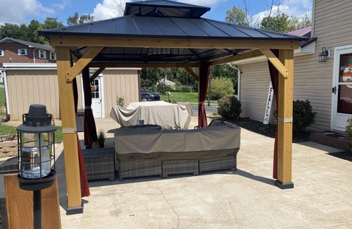 We have one bedroom and one bathroom. We can also set up a queen size mattress in living room if needed for more than 2 guests. Enjoy the large back yard and patio that can be used for outdoor fun. Soak up some sun in our 18’ above ground pool (open mid-may through mid-September). Cookout on our charcoal grill. Cozy up next to fire with our wood fire pit.