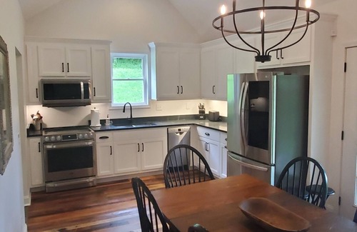 This country getaway was originally built in 1852 and was recently remodeled with top-of-the-line appliances and amenities. It includes an open floor plan, two fireplaces, three bedrooms, two bathrooms (soaking tub and multiple shower heads), a front porch with swing, a screened in porch, a side patio with grill and fire pit and a large backyard with playground. If you want to relax, slow down your pace and listen to the sounds of the country, while still being minutes from town, this place is for you.