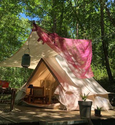 8.5 miles from Peak of Bugarach in Rennes-les-Bains, Tente aménagée pour 1 ou 2 personnes features accommodations with access to a hot spring bath. With mountain views, this accommodation offers a terrace. Guests can use a garden. There is a seating area, a dining area, and a kitchenette complete with a fridge, a stovetop, and kitchenware. The property has an outdoor dining area. There is an on-site bar. Peyrepertuse Castle is 23 miles from the luxury tent, while Termes Chateau is 25 miles from the property. Carcassonne Airport is 31 miles away.