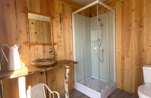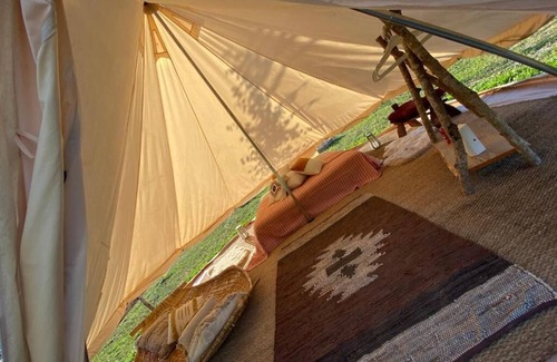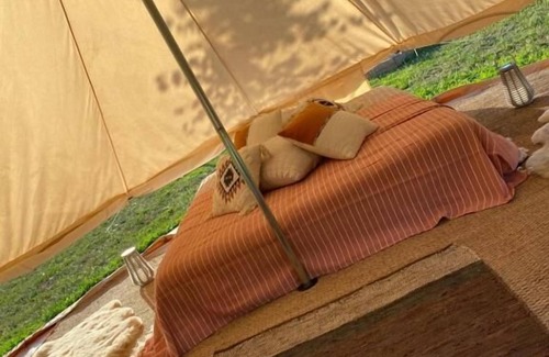 In the l'aventurière tent, you'll find a savannah ambience in coffee-beige colors, a 160x200 double bed, a Filipino hammock with cushions, a handcrafted closet, solar lamps or USB plugs, and an electrical outlet.