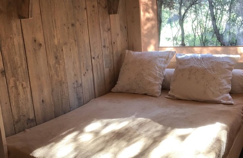 UN HEBERGEMENT INSOLITE, CONFORTABLE, NICHE AU MILIEU DES ARBRES, DANS UNE PROPRIETE DE QUALITE, DANS LA CAMPAGNE UZETIENNE, ENTOURE D'ANIMAUX (chevaux,ânes, alpagas, volaille, chats, chiens...)