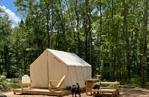 Your Signature campsite sleeps up to 4 campers - two on the Queen Bed (with bedding) in the platform safari tent and up to 2 additional campers in the included pop-up tent. The site also comes with a picnic table, fire pit, and Adirondack chairs where you can kick back and take in the stars at night. Our campsite is pet-friendly as long as your dog does well with other dogs and small children.