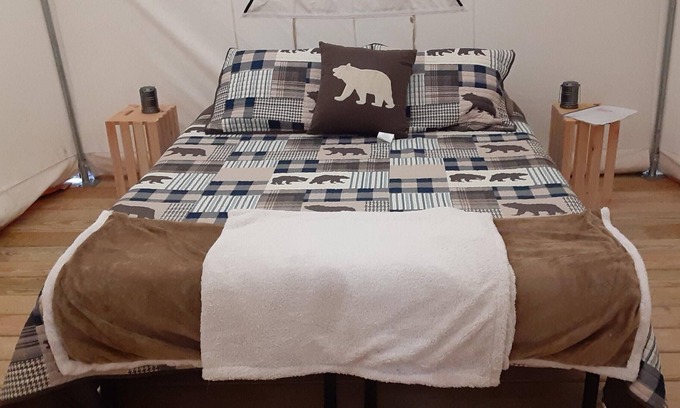 Your Tentrr campsite includes a 10'x12' (120 square feet) safari-style canvas tent on a raised wooden platform. Inside the tent you'll find one queen bed or a queen-size bunk bed (see photos for the exact setup). The tent is big enough for the bed plus one or two extra sleeping bags on the floor. Aside from the canvas tent, campers can also use the extra 5-person pop-up dome tent that’s provided. You'll also have a 6-ft picnic table, outdoor fire pit, 2 Tentrr Adirondack chairs, and a heating source to keep you warm and toasty at night.
