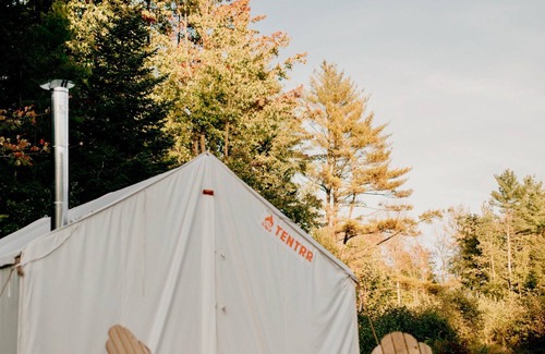 Each campsite includes a 10'x12' safari-style canvas tent on a raised platform, and you'll find one queen bed or a queen-size bunk bed inside (each site is different, see photos for the exact setup). Larger groups can also use the extra 5-person pop-up dome tent that’s provided (you’re welcome to bring your own camping gear too). You'll also have a 6-ft picnic table, outdoor fire pit, 2 Tentrr Adirondack chairs, and a heating source to keep you warm and toasty at night.