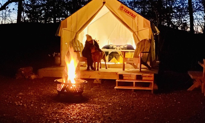 Your Tentrr campsite includes a 10'x12' (120 square feet) safari-style canvas tent on a raised wooden platform. Inside the tent you'll find one queen bed with a memory foam mattress. The tent is big enough for the bed plus one or two extra sleeping bags on the floor. Aside from the canvas tent, campers can also use the extra 5-person pop-up dome tent that’s provided. You'll also have a 6-ft picnic table, outdoor fire pit, and 2 Tentrr Adirondack chairs.