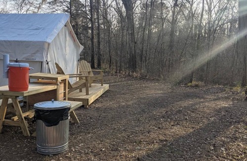 Campsite C is nestled at the top of a hill overlooking the beautiful forested woods of Chicot State Park. Right outside of one of the tents, is a BEAUTIFUL light pink and magenta azalea bush that is full of blooms in the spring time. There's tons of shade and big beautiful trees. With all of our rentals, you will have access to all of Chicot's fishing, hiking, and other outdoor activities. This tent is within a 10 minute walk, or a 1 minute drive from the splash pad. It's a small waterpark with fountains and sprayers for kids to play in! Parking is provided right at the tent. The drive to get to the site is completely paved as well as the parking spaces.