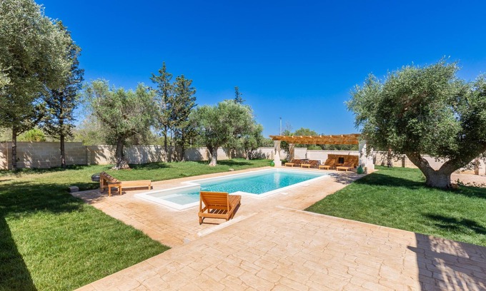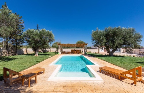 Pietro in Bevagna, in the green countryside of Avetrana. The swimming pool with solarium and outdoor shower is shared with the guests of the other two units.