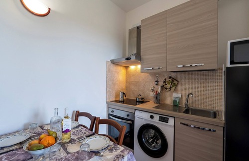 The first studio apartment for 4 is on the ground floor and looks out over Tenuta Ricco’s attractive swimming pool. It is elegantly furnished with a wrought-iron double bed and a sofa, which converts into a double bed. There is an en suite bathroom with a shower, basin, bidet, washing machine and WC. The studio also has a table for 4, a flat-screen TV and a wardrobe for storage. In the corner, guests will find a fitted kitchenette. This is well-equipped with an induction hob, oven, microwave, Moka coffee maker and a fridge/freezer.
