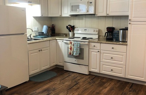The apartment is rustically furnished with brand new custom ordered furnishings, including queen-size beds/mattresses. Also, found in the apartment is a TV in each bedroom and living room, on-site Fiber Optic 5G WIFI, outside lounging furniture on a viewing deck as well as on the ground floor patio. A full-size stove/oven, refrigerator, counter-top ice maker, microwave, filtered drinking water, coffee pot, dishes, pots & pans, linens, towels, washer & dryer (bring your own laundry soap) and an outdoor gas grill are all provided. Tabletop heater and a fire pit are also available to ensure the enjoyment of the outdoors, even on cooler evenings. The apartment comes equipped with a sophisticated mini-split heating and air conditioning system as well as a back-up generator for any unexpected power outage.