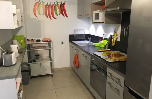Appliances: fridge (192 L), freezer (98 L), dishwasher, ceramic hob, oven, microwave, coffee maker, kettle, toaster…. Washing machine, drying rack, iron. Vacuum. Hair dryer.