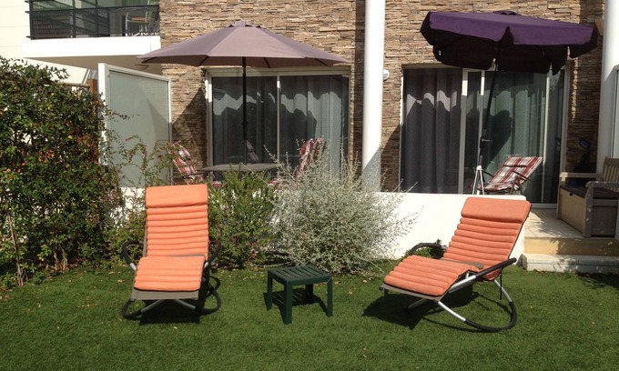 Enjoyment of our private garden, a lovely green setting of 320 m2, exclusively reserved for the guests of our apartments. Very popular with children of all ages ... and their parents.