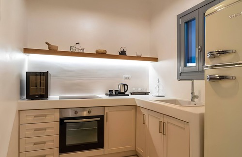 The suite is 80 sqm with a very comfortable design with a spacious interior. It has a bathroom with all the comforts along with an internal jacuzzi specially designed to offer unique moments of relaxation. There is also a capacious fully equipped kitchen able to serve all your needs during your stay. The flawless decoration in Cycladic style based on the white color and geometric lines compose a modern harmonious environment that is suitable for high expectations and requirements.