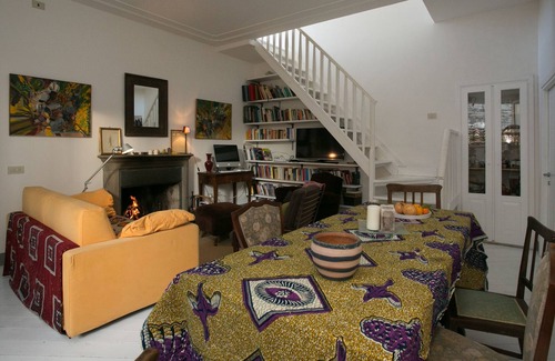 Spacious with sofa, large table with chairs, armchairs, working chimney, bookshelves, TV, wardrobe, window, stairs leading to the top floor;