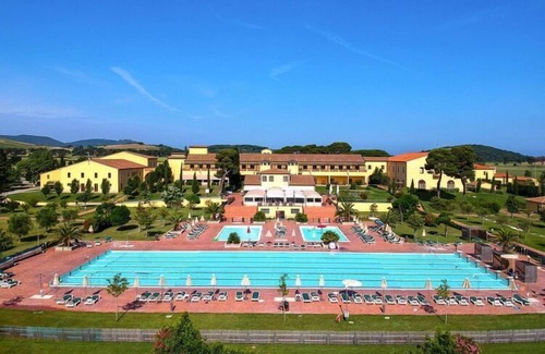 Near the dream beaches of the famous Gulf of Baratti: Former agricultural estate, embedded in a spacious and well-kept garden. The 8 buildings have been faithfully restored in the original Tuscan style and transformed into a beautiful holiday resort with elegant, tasteful apartments. A special highlight is the large pool, which even has Olympic dimensions. There are also two other pools - one for adults (with hydro-massage) and one for children. Enjoy good Tuscan cuisine in the farm's restaurant. In high season, guests can take advantage of the Gulf Beach shuttle service for a fee. More long, natural sandy beaches with pine forests in front of them stretch as far as San Vincenzo. Activities nearby: Visit San Vincenzo with its new port and small center. Take a trip through the "Cornia Valley", the well-known wine route and stroll through the medieval village of Suvereto. A day trip to the island of Elba is also recommended - the ferries to Elba leave almost every hour in Piombino (10 km). Note: WiFi is only available outdoors.